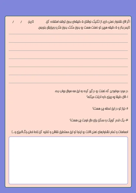 دفتر Mindbook در سایز A5 طراحی شده تا فضایی امن برای تخلیه ذهن و آرامسازی افکار باشد. با تکنیک نوشتن ۵ دقیقهای، میتوانی بدون توقف و قضاوت هرچه در ذهنت میگذرد بنویسی. پرسشهای هدایتگر کمک میکنند نیازت را بشناسی و یک قدم کوچک برای حال بهتر برداری. بخشی برای تخلیه احساسات و نقاشی آزاد نیز در نظر گرفته شده تا ذهنت سبکتر و متمرکزتر شود.پرسشهای هدایتگر داخل دفتر کمک میکنند: